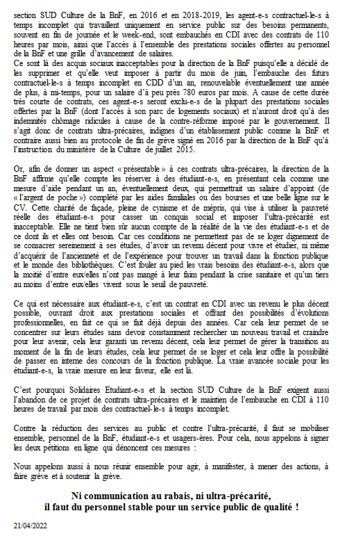 Auteur Publié le 6 mai 202212 mai 2022Catégories Appels unitairesÉtiquettes Bibliothèque nationale de France (BNF), précarité, sous-effectif