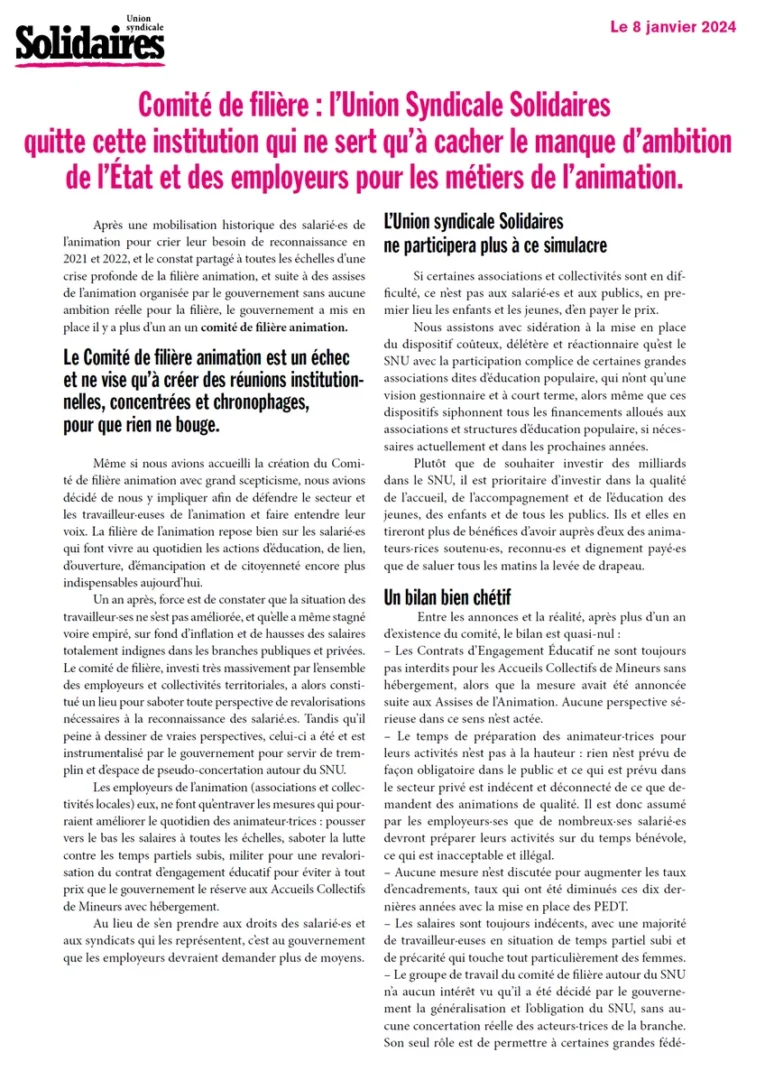 Comité de filière : l’Union Syndicale Solidaires quitte cette institution qui ne sert qu’à cacher le manque d’ambition de l’État et des employeurs pour les métiers de l’animation
