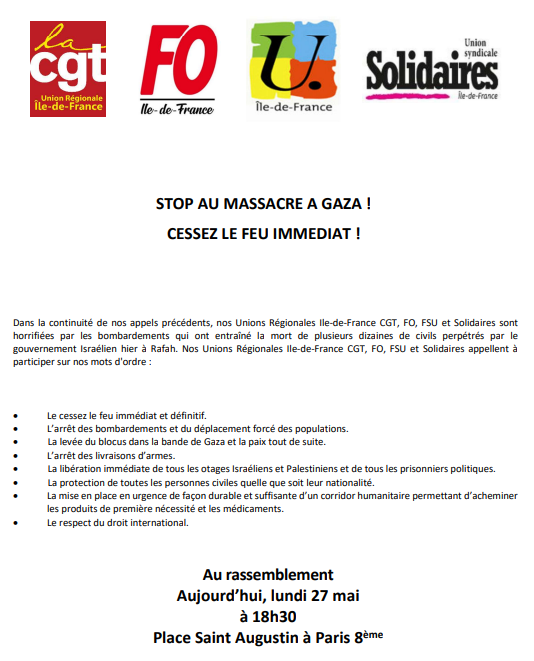 Auteur Publié le 27 mai 202427 mai 2024Catégories Appels unitairesÉtiquettes Gaza, manifestation