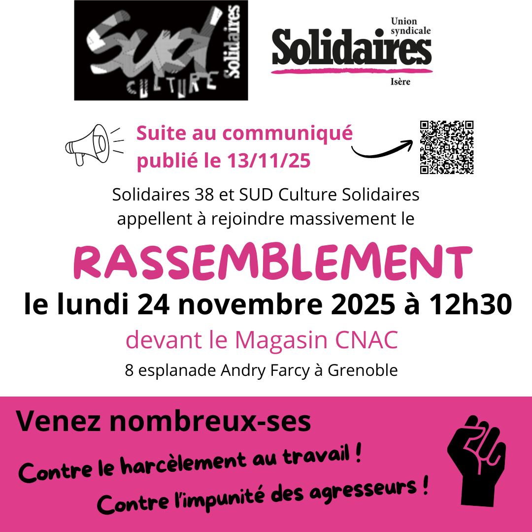 Suite au communiqué « Harcèlement(s) et violences au travail, une institution qui protège ses agresseur·ses » publié le 13 novembre 2025 Solidaires 38 et SUD Culture Solidaires appellent à rejoindre massivement le rassemblement :