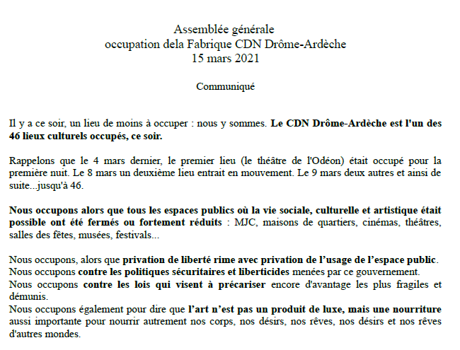 Communiqué des occupant.es de la Fabrique CDN Drôme-Ardèche