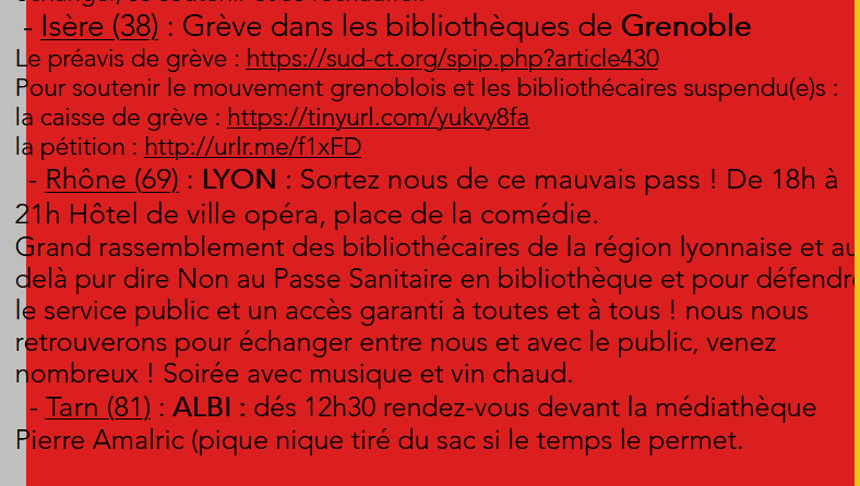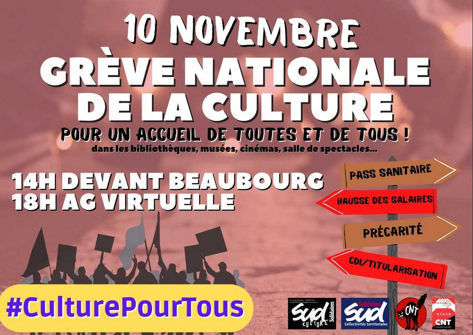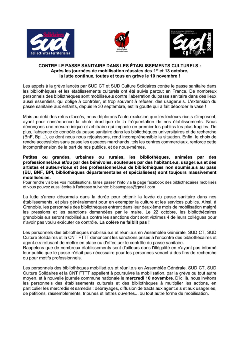 Les bibliothécaires sont en lutte depuis l’été dernier contre le passe sanitaire. Les trois journées de grève nationales ont été fortement suivies. Alors que le dispositif du passe sanitaire a été prolongé jusqu’en juillet 2022, SUD CT, SUD Culture, la CNT et la CNT-STUCS appellent à poursuivre la mobilisation et à faire grève le 1er décembre 2021.