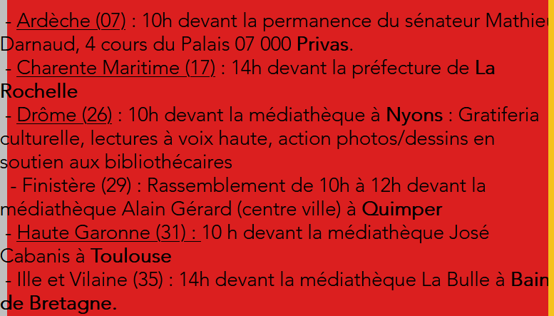 Le maintien du dispositif de contrôle dans les lieux culturels, et dans les bibliothèques en particulier, continue de contrevenir à leurs missions essentielles et de pénaliser les publics les plus précaires, déjà éloignés du livre, de la lecture et de la culture. L’accès aux bibliothèques et aux lieux culturels doit rester sans discrimination et inconditionnel. Nous demandons des véritables mesures de protection contre l’épidémie, qui ne sanctionnent ni le public, ni les agent-es : retour des jauges en cas de remontée des contaminations, masques FFP2 pour les personnels, ventilation adéquate, capteurs de C02…
