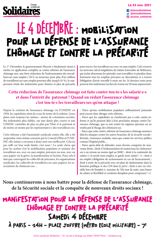 Le gouvernement actuel, dans son processus de destruction et de démantèlement du système social, cherche à intimider celles et ceux qui voudraient s’y opposer. Tout est bon : arrestations arbitraires, humiliations, procédures judiciaires. Claire, coupable d’être venue manifester samedi 5 décembre contre le chômage et la précarité, a subi des violences policières, a ensuite passé deux jours en garde à vue, pour être finalement présentée au tribunal de grande instance (TGI).