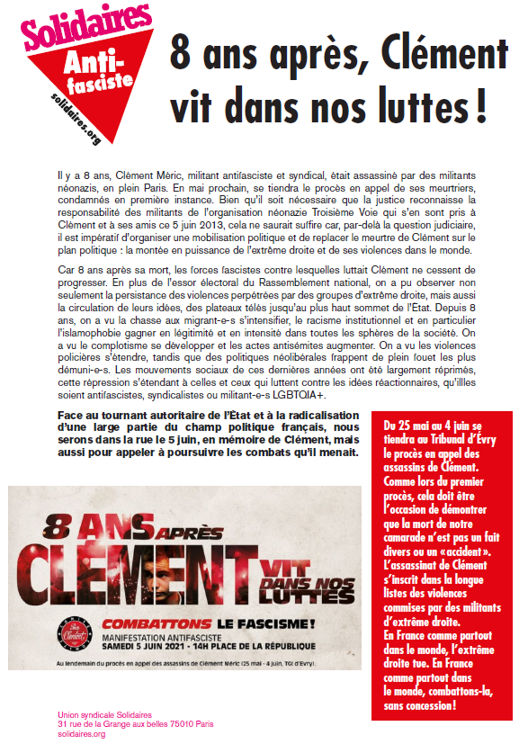 Le 5 juin 2013, à Paris, Clément Méric, syndicaliste à Solidaires étudiant-e-s et militant antifasciste, tombait sous les coups de militants néo-nazis.