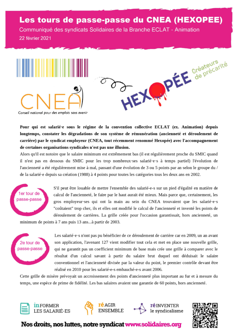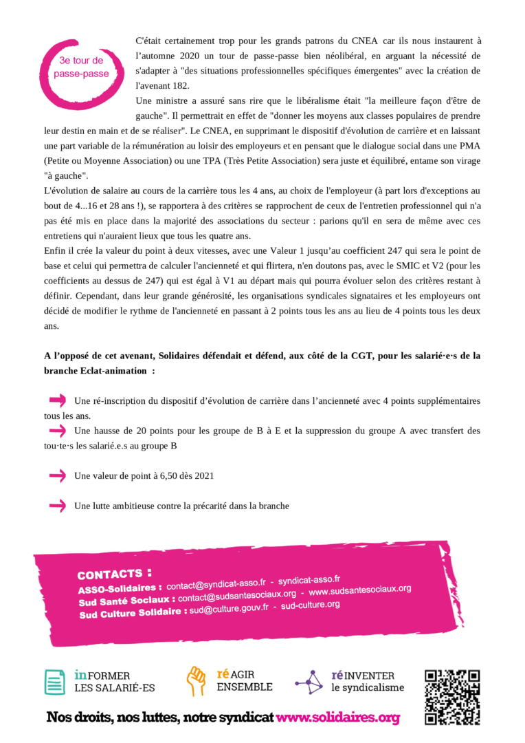 Le CNEA**, syndicat employeur du secteur associatif, projette de diminuer les salaires dans une logique comparable à celle du MEDEF. Profitant de la demande de l’Union syndicale Solidaires et de la FERC-CGT de travailler sur la question des bas salaires, le CNEA propose un nouvel avenant qui précarise encore plus les salarié-e-s des associations :
