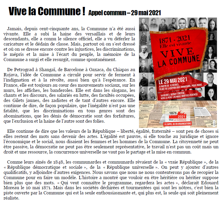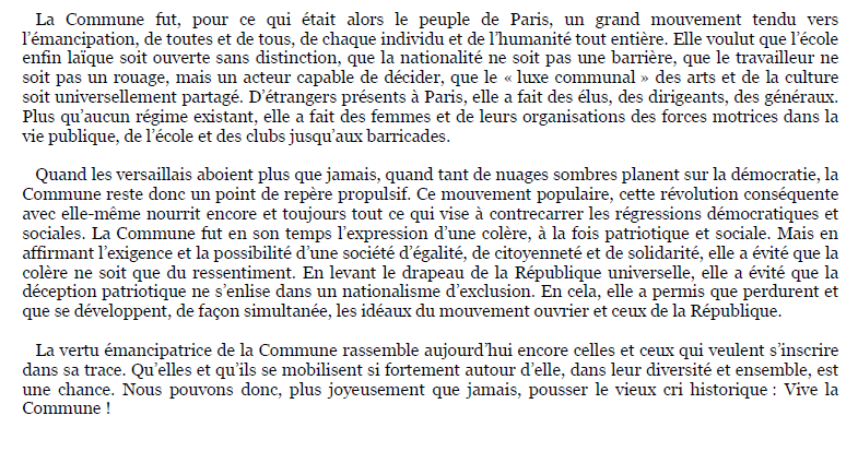 Plus que jamais, la Commune reste une source d’inspiration et de confiance pour toutes celles et tous ceux qui se réclament, encore et toujours, des valeurs de la République démocratique et sociale, une République émancipatrice et universelle. Face à la haine intacte des versaillais d’aujourd’hui, manifestons la solidarité joyeuse que stimule son héritage.