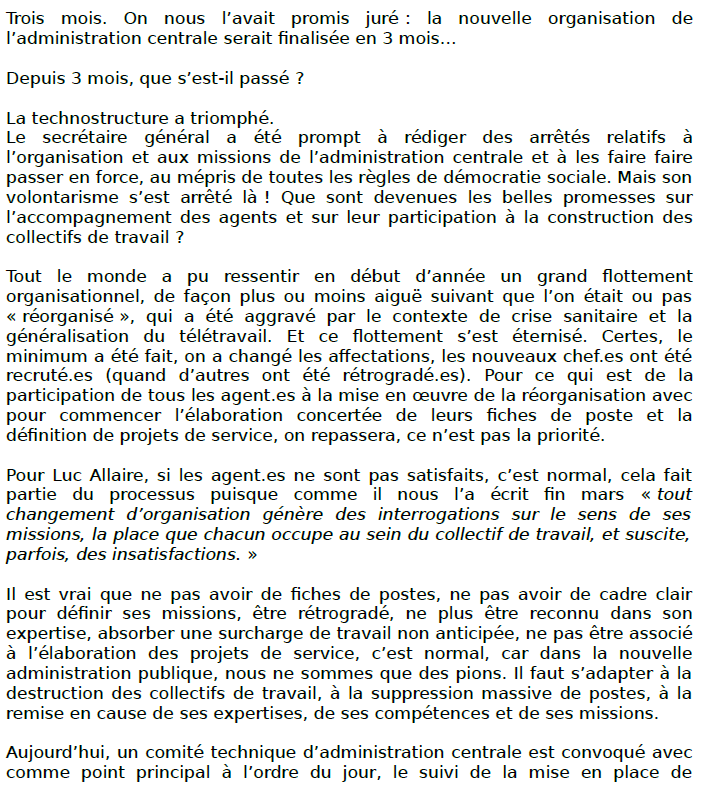 Nous ne vous rappellerons pas enfin que, derrière ces textes, il y a des agent-e-s qui subissent une réorganisation qui leur est imposée d’en haut, sans tenir compte de leur expertise et qui remet en cause leurs missions.