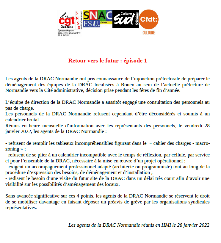 A la demande des représentant.es du personnel, un CT Spécial des DRAC avait été convoqué ce jour à partir de 9h30. Initialement prévu sur une journée, nous avons appris la semaine dernière que celui-ci se réduisait à une demi-journée.