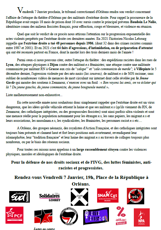 On est là ! Alors dès maintenant organisons-nous, ensemble, aux côtés des collectifs de sans-papiers et migrant·e·s, aux côtés des familles de victimes des violences policières et pénitentiaires, aux côtés des syndicalistes en lutte, aux côtés des collectifs et associations dans nos quartiers pour ne pas laisser un pouce de terrain à l’extrême-droite et à ses idées, pour riposter à chaque attaque et faire vivre l’égalité et la solidarité.