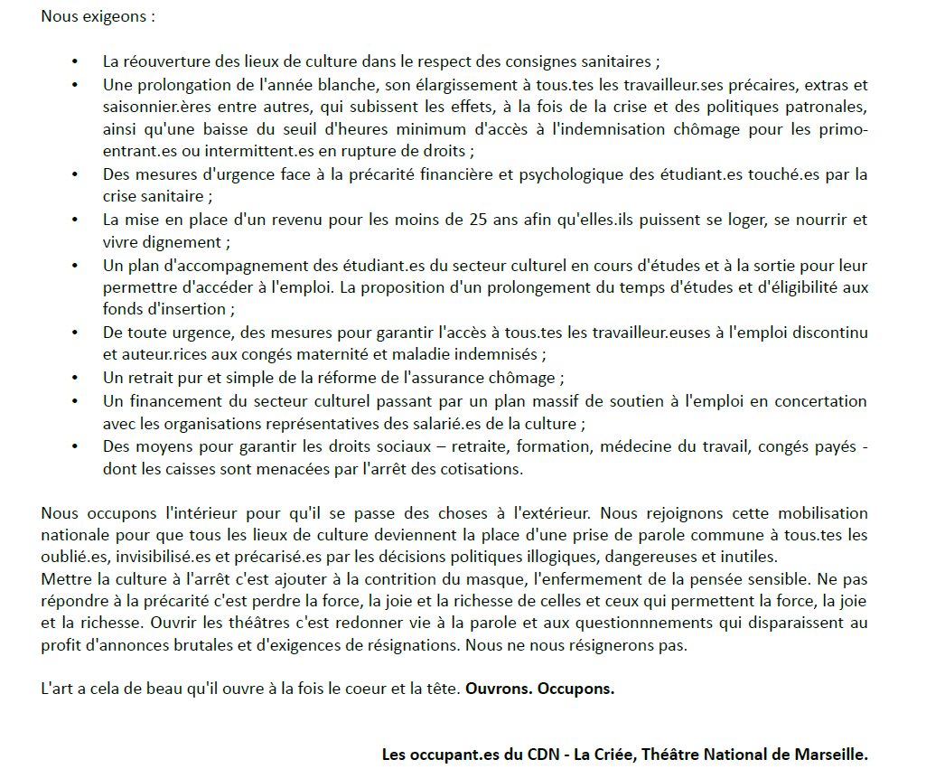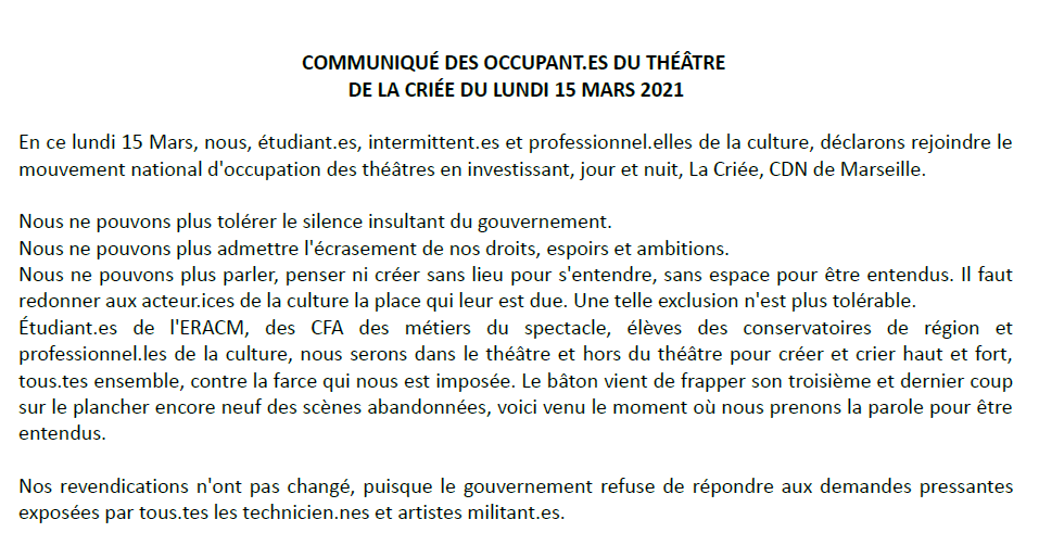 Marseille : communiqué des occupant.es du théâtre de la Criée