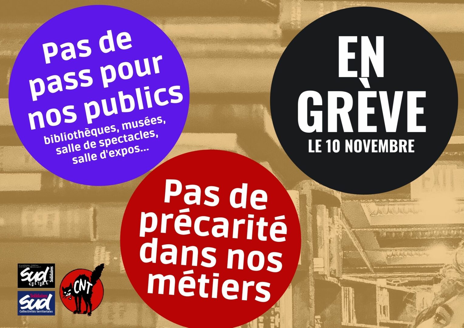 Les bibliothécaires sont en lutte depuis l’été dernier contre le passe sanitaire. Les trois journées de grève nationales ont été fortement suivies. Alors que le dispositif du passe sanitaire a été prolongé jusqu’en juillet 2022, SUD CT, SUD Culture, la CNT et la CNT-STUCS appellent à poursuivre la mobilisation et à faire grève le 1er décembre 2021.