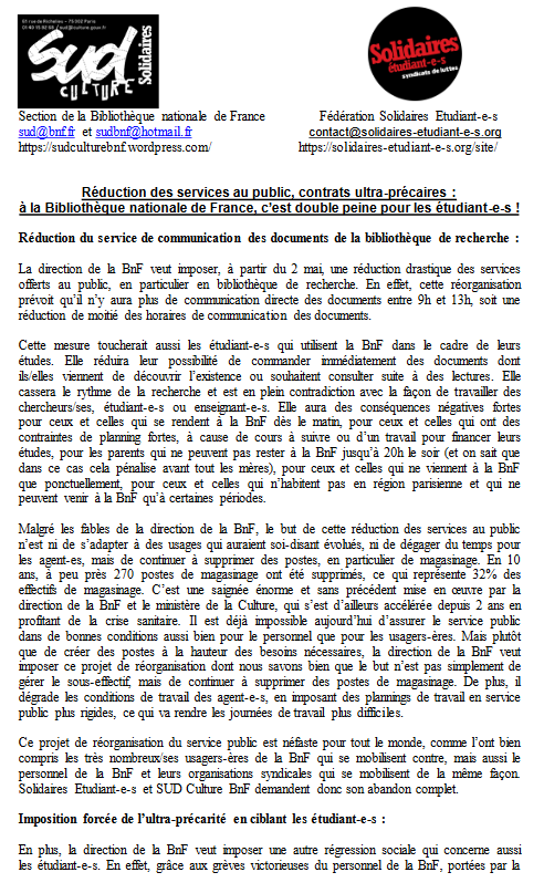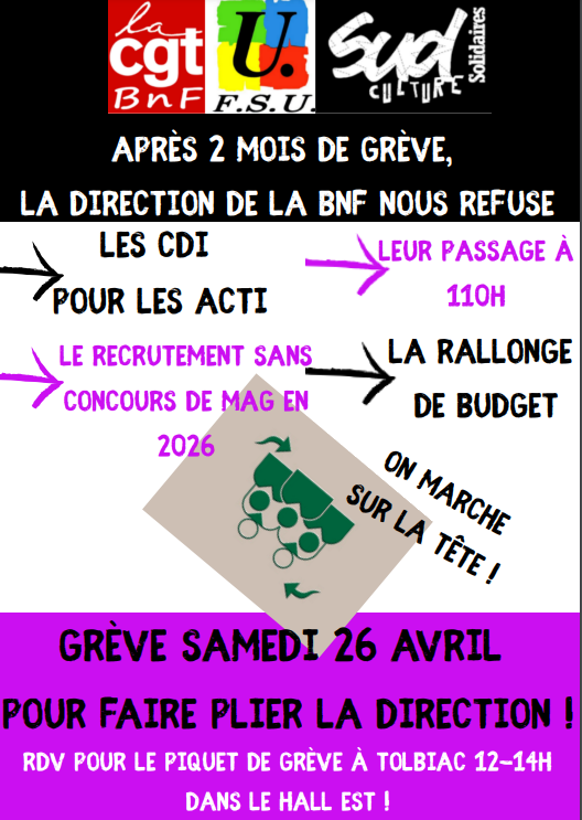 Continuer la lecture de « Toute la BnF en grève à partir du 23 mai »Intersyndicale BnF : CGT, FSU, SUD